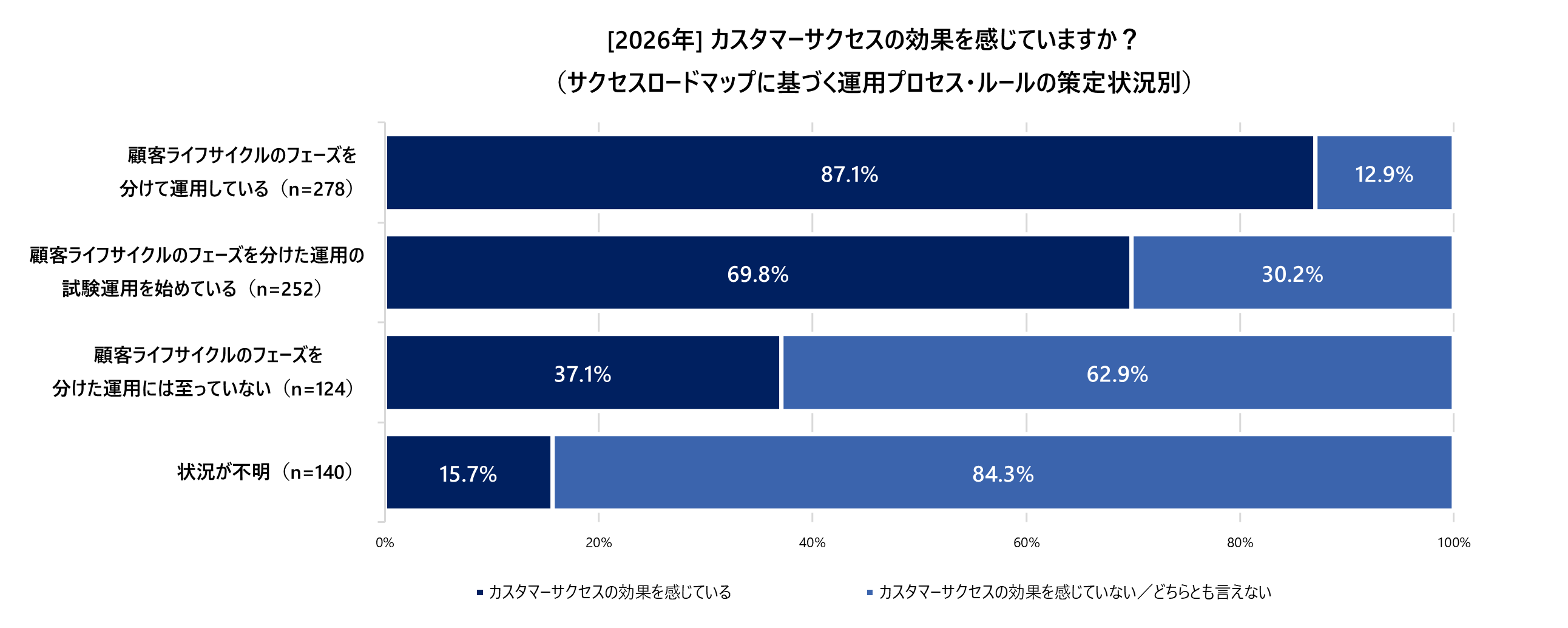 この運用プロセスの策定状況によって、カスタマーサクセスの効果体感が大きく変わっています。フェーズ分け運用を行っている層(n=278)の、実に87.1%がカスタマーサクセスの効果を体感しているのに対し、フェーズ分け運用に至っていない層(n=124)でその効果体感は37.1%にとどまり、約2.3倍もの格差が生じています。