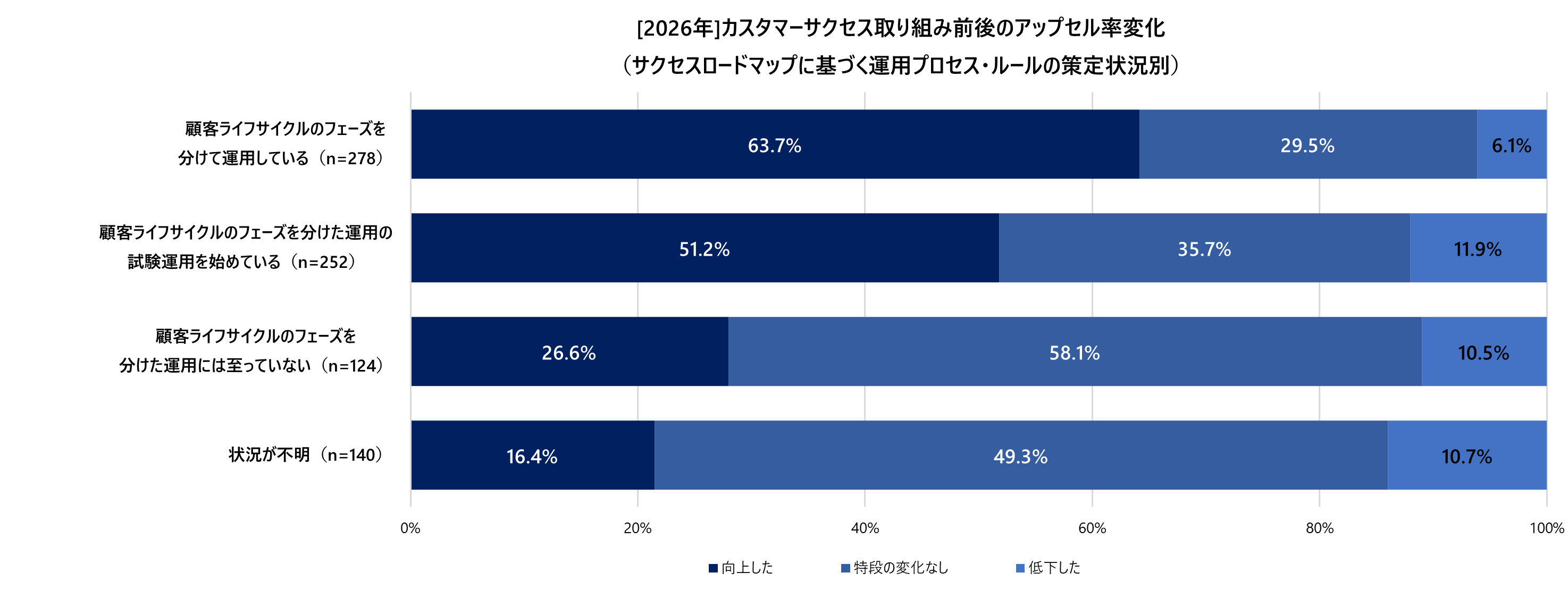 標準化されたプロセスを持つ企業の73.7%が増収を実現し、63.7%がアップセル率を向上させています。運用工程の確立が、単なる維持にとどまらない「稼ぐカスタマーサクセス」への転換を牽引しています。