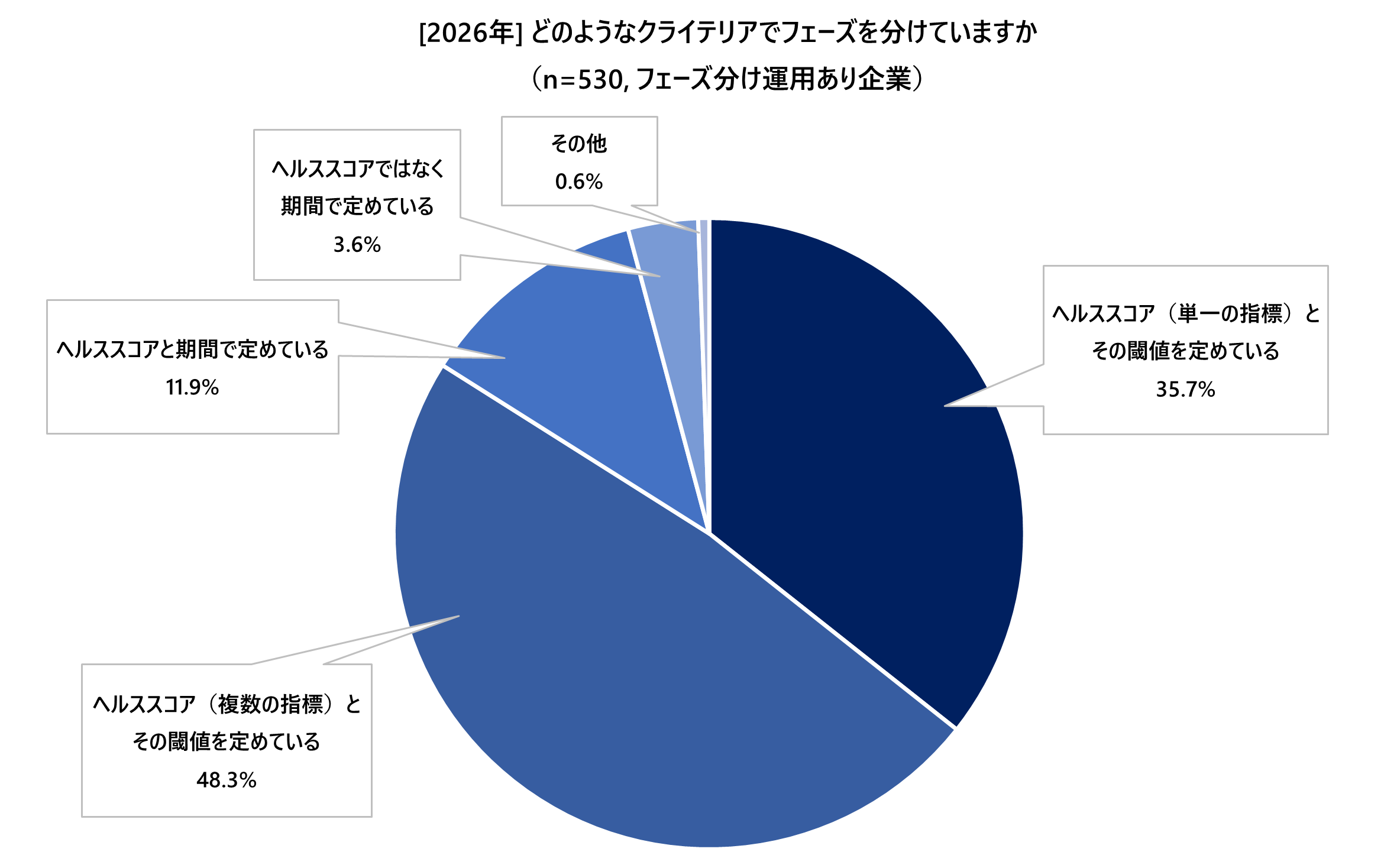 顧客ライフサイクルのフェーズを分けて運用している、または試験運用を始めている層(n=530)に対し、どのようなクライテリア(判断基準)でフェーズを分けているかを尋ねたところ、「ヘルススコア(単一の指標)とその閾値を定めている(35.7%)」、「ヘルススコア(複数の指標)とその閾値を決めている(48.3%)」、「ヘルススコアと期間で定めている(11.9%)」、「ヘルススコアではなく期間で定めている(3.6%)」、「その他(0.6%)」という結果になりました。