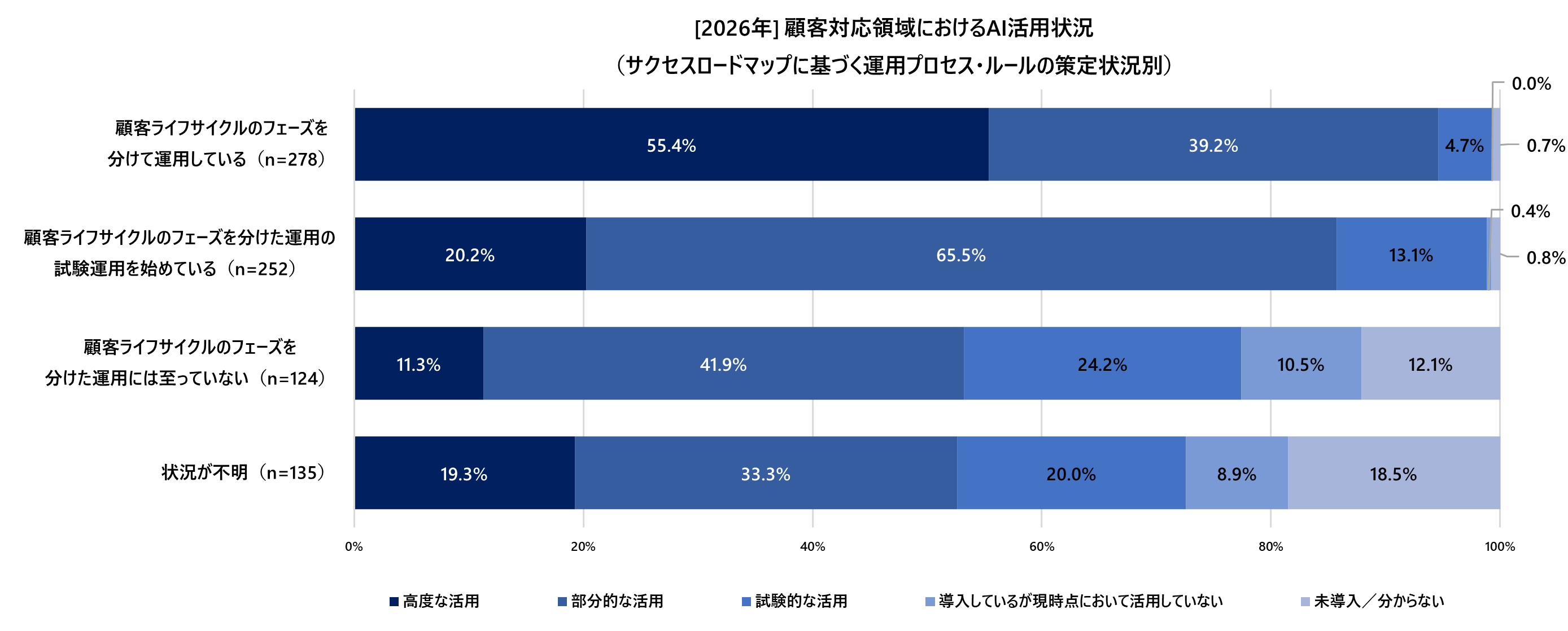 運用ルールが確立された企業では、AIの高度な活用が20.2%から55.4%へと、2.7倍という、急速な伸びを記録しています。これは、顧客対応の型が確定したことで、どの工程にAIを組み込み、どのような判断を委ねるべきかという戦略的確信が得られた結果と考えられます。運用ルールの確立は、テクノロジーのポテンシャルを実務成果へと変換するための、実質的な「起動条件」となっています。